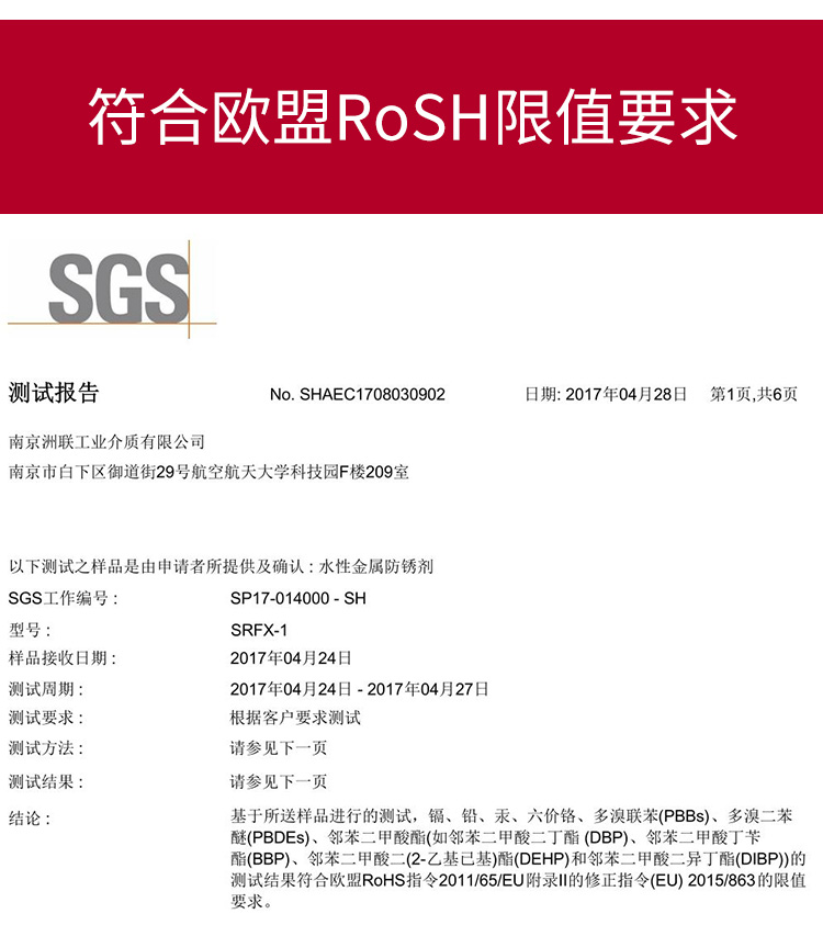 防銹劑清澈透明,無油污,易清洗。綠色環(huán)保,不含鋅、醛、重金屬、亞硝酸鈉、酚等對人體和環(huán)境有害的物質,產品符合歐盟 RoHS 限值要求;對皮膚無刺激性;夏季使用不霉變、不發(fā)臭;本品可以長期保存,無沉淀、無分層、無結晶物析出。本品在金屬表面形成一層覆蓋均勻的防銹鈍化膜,這層膜使鋼鐵表面與外界環(huán)境隔離開,起到防止銹蝕的作用。